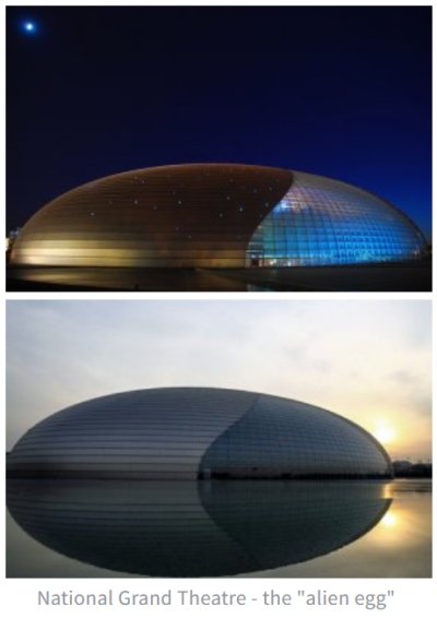 The dragon egg theme is evident in two very extravagant buildings built with the Olympics in mind: Terminal Three of the Beijing Airport is in the shape of a flying dragon. The National Grand Theatre is nicknamed the "alien egg."